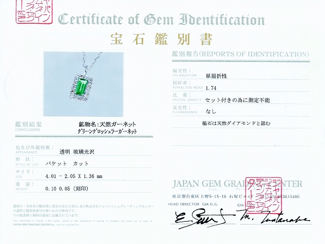 【S_quare】Pt900グリーンガーネットダイヤモンドネックレス GG0.10ctD0.05ct 1.0g 40cm【鑑別書付】